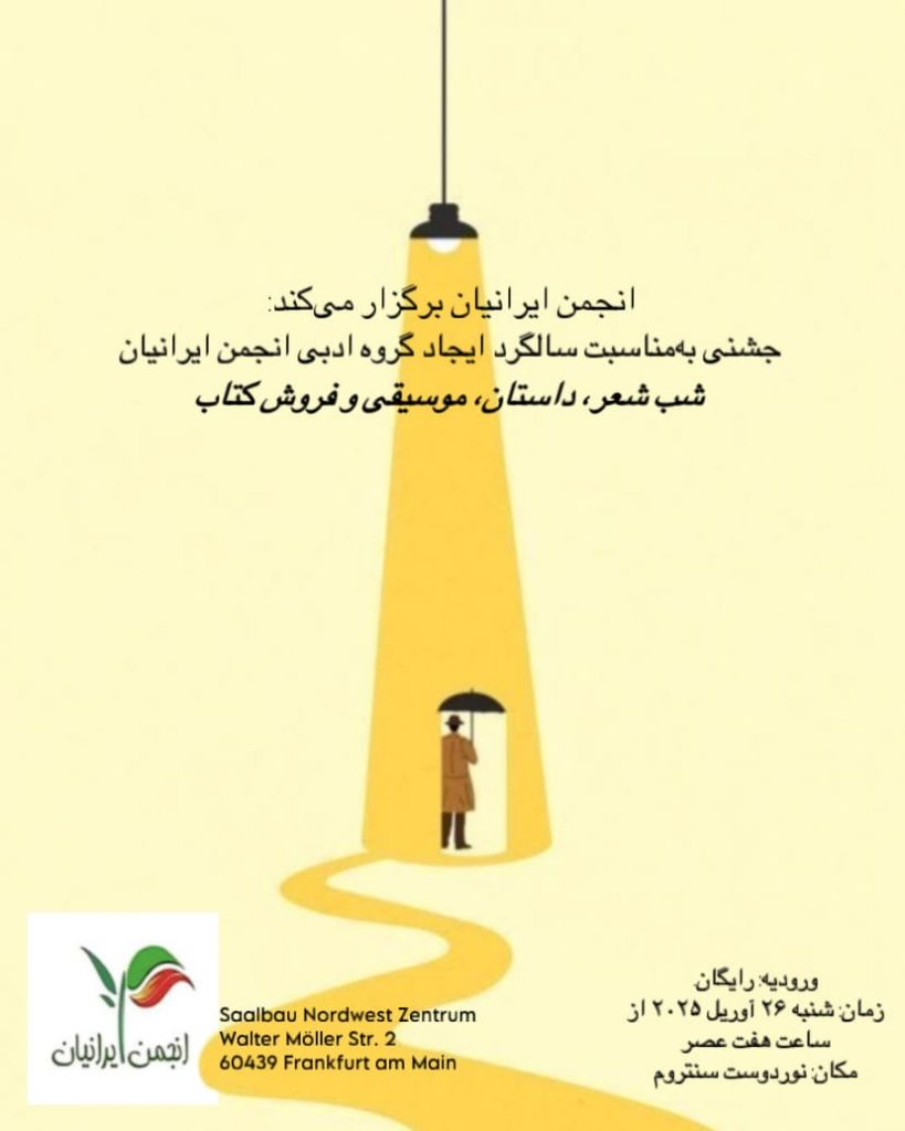 به این وسیله به اطلاع می رسانیم که جشن سالگرد گروه ادبی انجمن ایرانیان در فرانکفورت به سرپرستی نویسنده، مترجم و منتقد ادبی، رضا نجفی در تاریخ ۲۶ آوریل برگزار می شود.